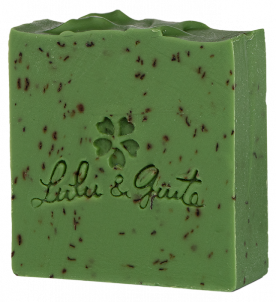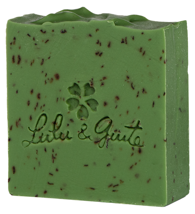 Composition : Beurre de karité saponifié, huile d’olive saponifiée, huile de coco saponifiée, eau, glycérine, huile de chanvre saponifiée, huile de jojoba, argile verte, huile essentielle de menthe poivrée, huile essentielle de menthe verte, huile essentielle de vétiver, oxyde minéral vert, feuilles de menthe séchées, vitamine E.
